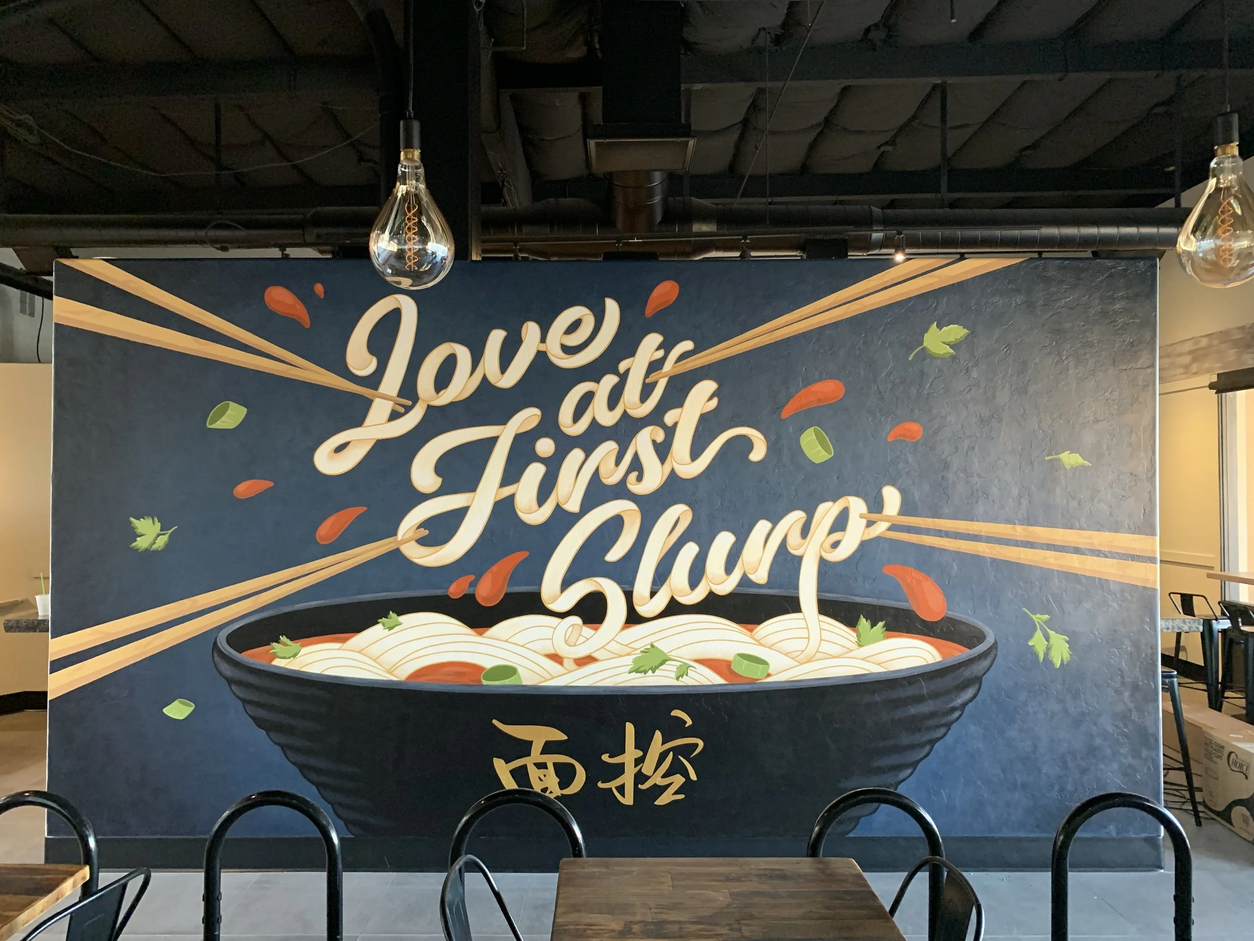 This playful mural was a creative free-for-all! With minimal direction from the client, we had the chance to bring our own vision to life. We designed the phrase Love at First Slurp using dynamic lettering that flows right out of a steamy bowl of noodles.